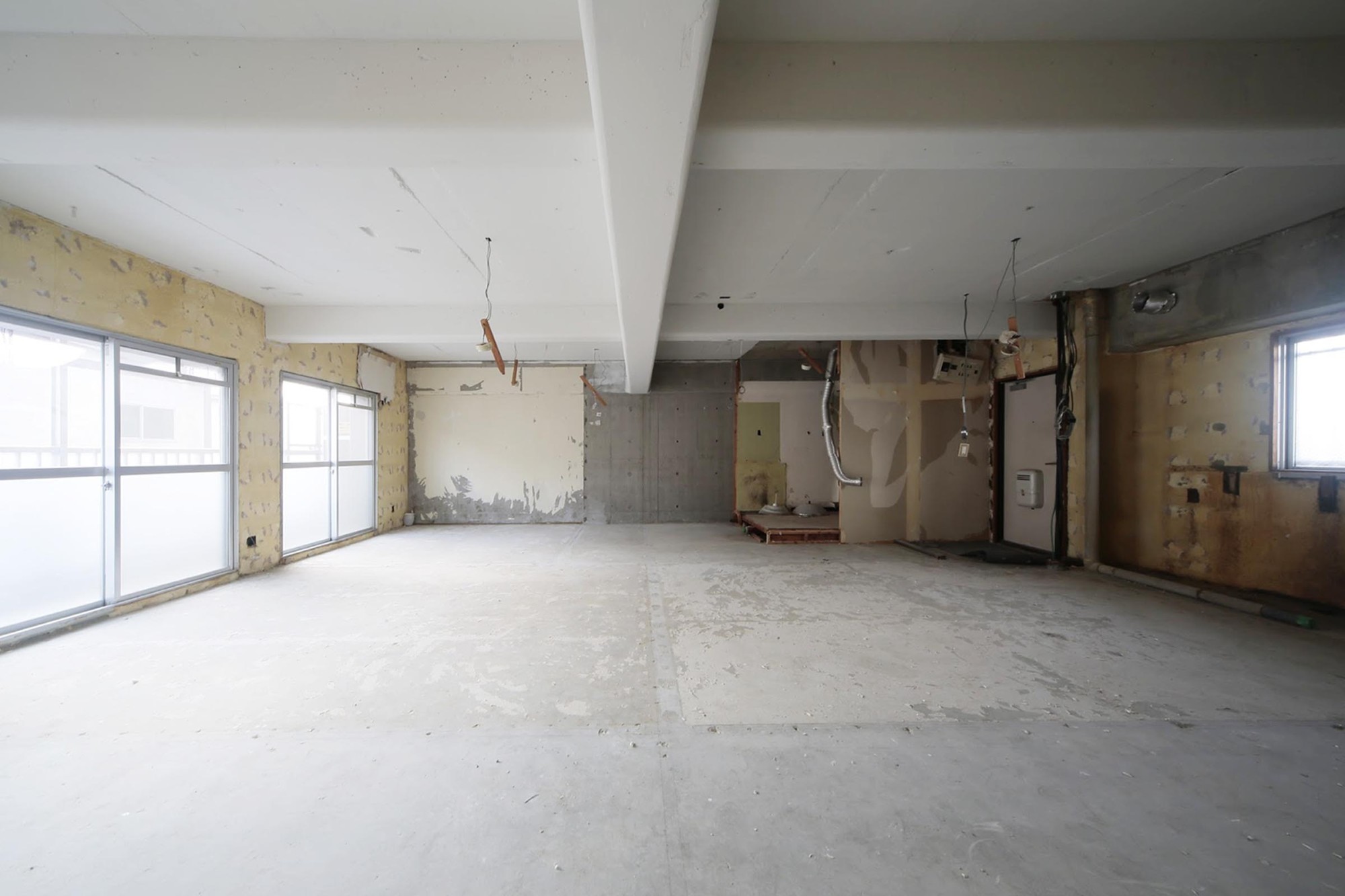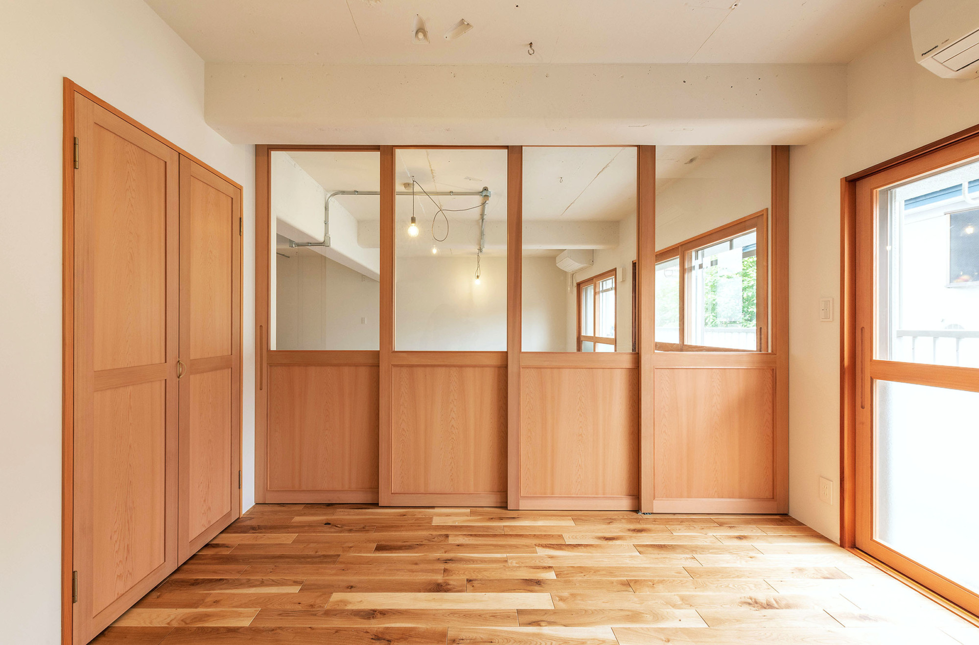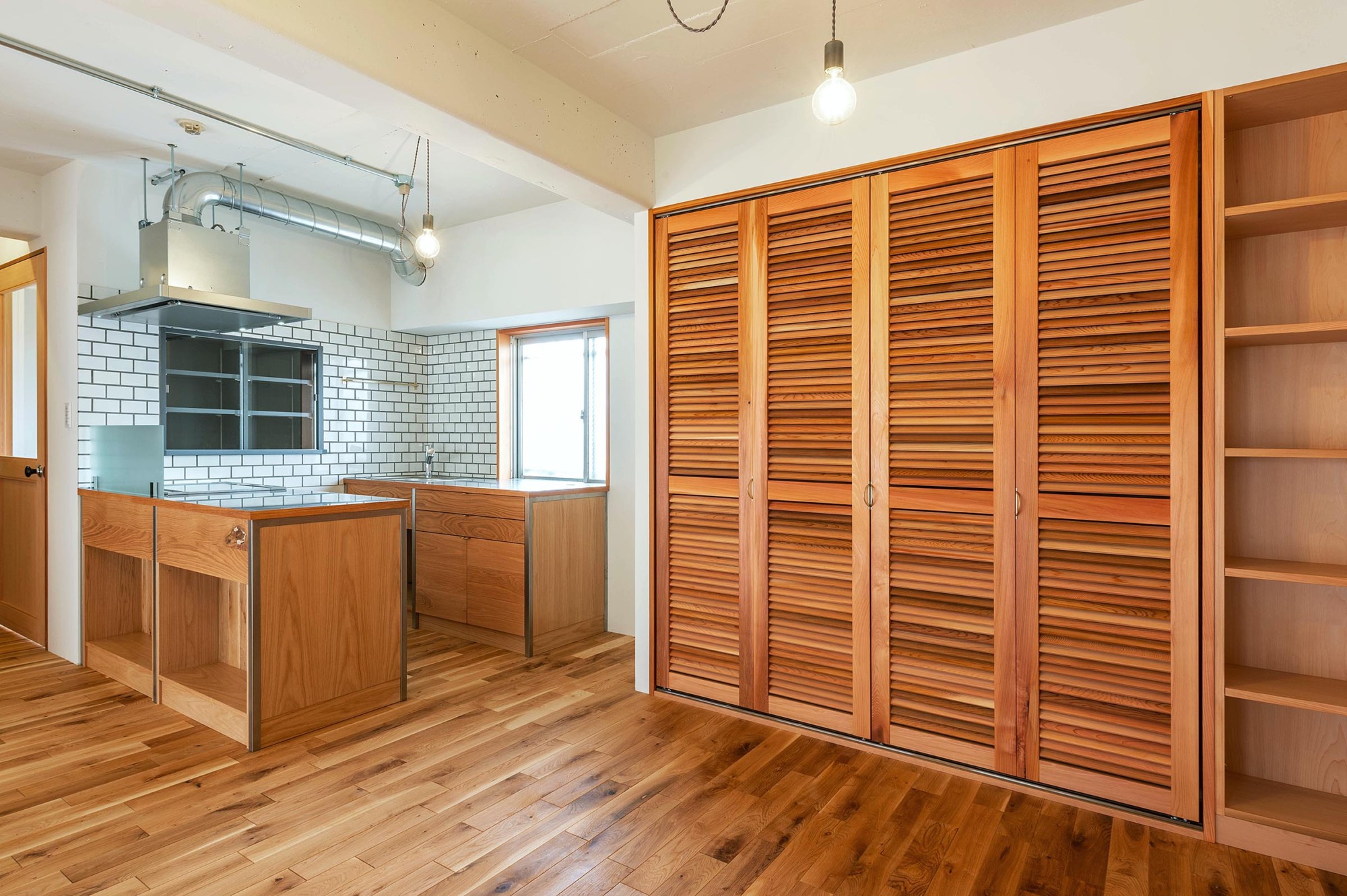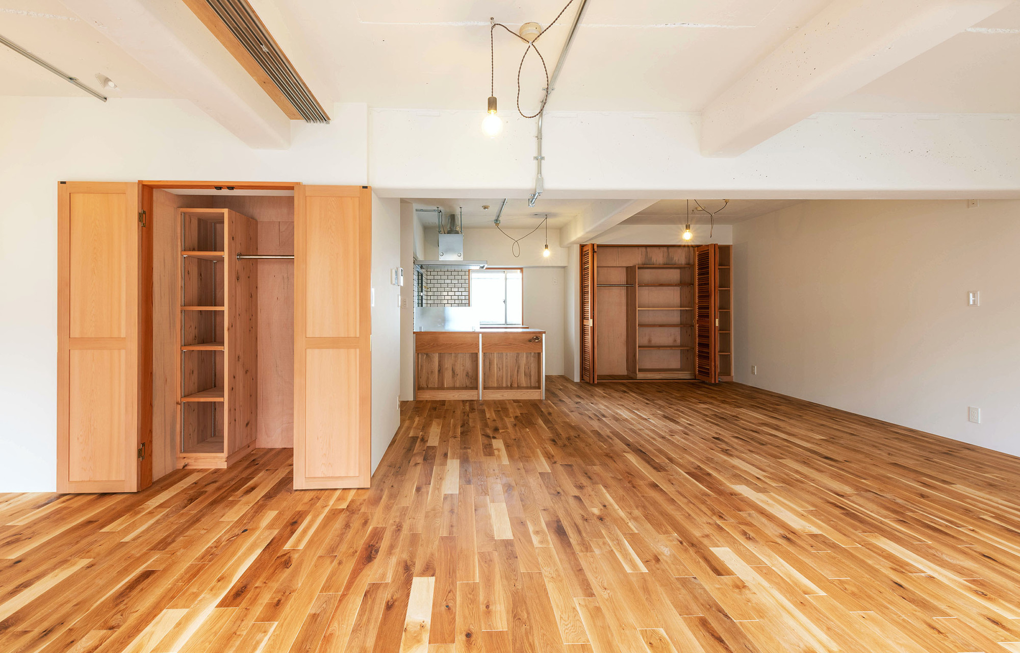 既存の間仕切り、天井を取り去り、広々としたワンルームに空間を再構成。家族構成や間取りに左右されることなく、オーナーの生活スタイルによってフレキシブルに活用可能な空間とした。各種住宅設備機器の新設に加え、壁及び床への断熱材の充填、木製インナーサッシの設置による断熱性能の向上も重視。ナラ無垢材の短尺フローリング材をはじめ、随所に素材のぬくもりや質感を感じられる明るく柔らかな空間へと生まれ変わらせた。